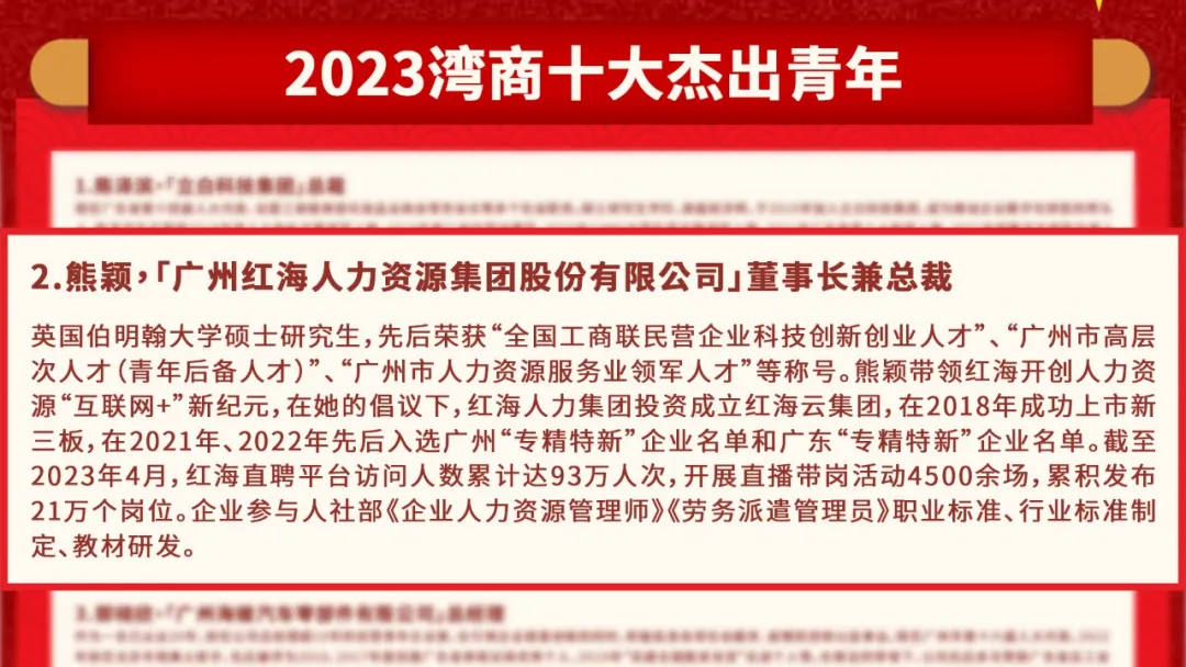 為順利開(kāi)展“2023灣商十大杰出青年”推選活動(dòng),推選委員會(huì)辦公室先后進(jìn)行資料審核、走訪考察、網(wǎng)絡(luò)投票、專家見(jiàn)面、專家評(píng)審等多個(gè)程序,其中重點(diǎn)關(guān)注學(xué)歷、社會(huì)職務(wù)、個(gè)人榮譽(yù)、企業(yè)經(jīng)濟(jì)貢獻(xiàn)、就業(yè)貢獻(xiàn)、納稅貢獻(xiàn)、公益慈善、企業(yè)成果等指標(biāo),結(jié)合行業(yè)前景、個(gè)人成長(zhǎng)、創(chuàng)新思維、社會(huì)擔(dān)當(dāng)、溝通能力等加分項(xiàng)。 綜合各方面情況,經(jīng)推委會(huì)辦公室研究,現(xiàn)推選出10名候選人入圍“2023灣商十大杰出青年”。另外,設(shè)立“2023灣商杰出青年”、“2023灣商杰出青年創(chuàng)新代表”特別獎(jiǎng)項(xiàng),鼓勵(lì)其他青年企業(yè)家再接再厲,接繼奮斗,再創(chuàng)輝煌。 紅海人力集團(tuán)董事長(zhǎng)兼總裁熊穎,是英國(guó)伯明翰大學(xué)碩士研究生。先后榮獲“全國(guó)工商聯(lián)民營(yíng)企業(yè)科技創(chuàng)新創(chuàng)業(yè)人才”、“廣州市高層次人才(青年后備人才)”、“廣州市人力資源服務(wù)業(yè)領(lǐng)軍人才”等稱號(hào)。 在她的帶領(lǐng)下,紅海人力集團(tuán)開(kāi)創(chuàng)人力資源“互聯(lián)網(wǎng)+”新紀(jì)元。在她的倡議下,紅海人力集團(tuán)投資成立紅海云集團(tuán),在2018年成功上市新三板,在2021年、2022年先后入選廣州“專精特新”企業(yè)名單和廣東“專精特新”企業(yè)名單。 受益于國(guó)家戰(zhàn)略及經(jīng)濟(jì)發(fā)展的推動(dòng),粵港澳大灣區(qū)是我國(guó)開(kāi)放程度最高、經(jīng)濟(jì)活力最強(qiáng)的區(qū)域之一。未來(lái),紅海人力集團(tuán)將不斷創(chuàng)新發(fā)展,推進(jìn)灣區(qū)企業(yè)人力資源數(shù)字化建設(shè),在促進(jìn)灣區(qū)人才建設(shè)和經(jīng)濟(jì)發(fā)展不斷向高質(zhì)量邁步。