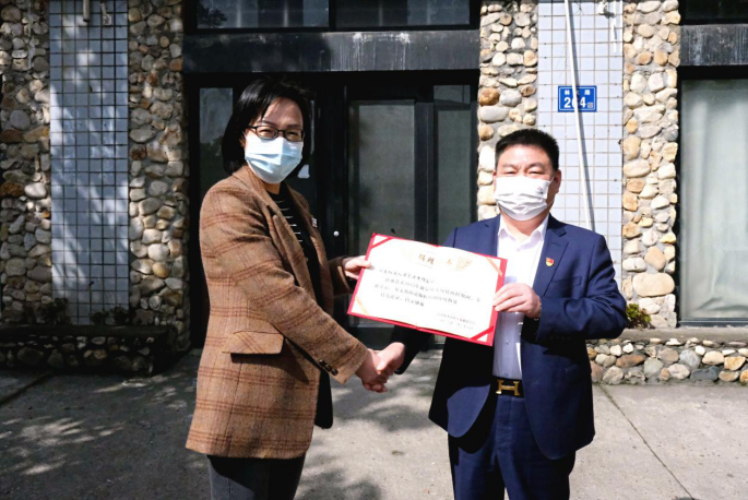 區(qū)政協(xié)副主席、工商聯(lián)主席王珊為湖南紅海人力頒發(fā)捐贈證書