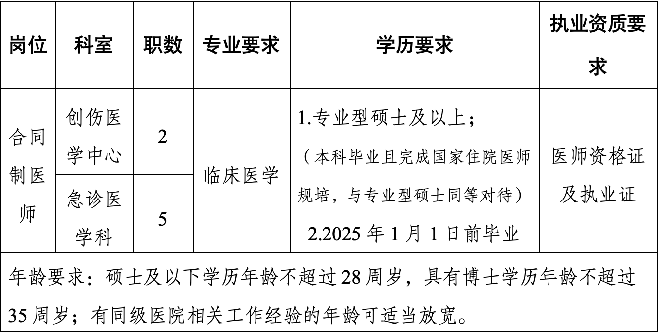 2.報(bào)名方式:采取線上報(bào)名,請(qǐng)將《應(yīng)聘人員信息登記表》(本人簽字掃描)作為附件發(fā)送郵件至47224640@qq.com,符合條件應(yīng)聘者,將統(tǒng)一安排在醫(yī)院進(jìn)行現(xiàn)場(chǎng)資料審核。不收?qǐng)?bào)名費(fèi),報(bào)名截止時(shí)間為2025年2月14日17:00。