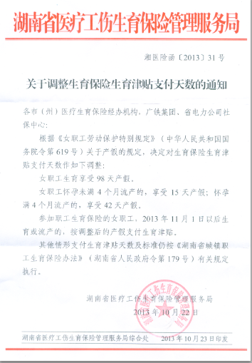 湖南省關(guān)于調(diào)整生育保險生育津貼支付天數(shù)的通知