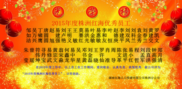 本次表彰大會(huì)歷時(shí)4個(gè)小時(shí),是株洲紅海對(duì)外派員工2015年度全年工作的一次獎(jiǎng)勵(lì),我們感謝所有員工齊心協(xié)力、奮發(fā)向上、辛勤工作,換來的豐碩收獲。一元復(fù)始,萬象更新,新的一年開啟新的希望,新的歷程承載新的夢(mèng)想。2016年我們將繼續(xù)努力,不斷提高專業(yè)水平,團(tuán)結(jié)協(xié)作,期待2016年株洲紅海公司能夠再鑄輝煌,事業(yè)騰飛!