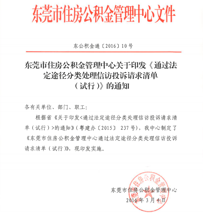 轉(zhuǎn)發(fā):東莞住房公積金管理中心關(guān)于印發(fā)《通過(guò)法定途徑分類(lèi)處理信訪投訴請(qǐng)求清單(試行)》的通知