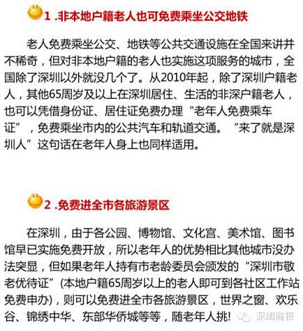 明年深圳市常住老年人口將達(dá)到100萬,按照聯(lián)合國的傳統(tǒng)標(biāo)準(zhǔn),深圳步入老齡化看來也不遠(yuǎn)了。你有想象過未來自己在深圳的晚年生活嗎? 深圳給老人帶來的福利: