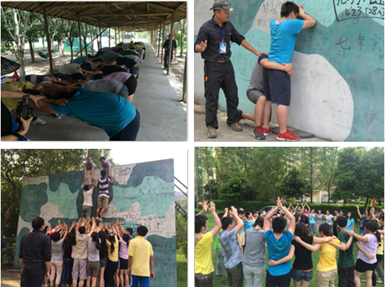 (“跨越勝利墻“拓展,學(xué)員屢敗屢試,成功完成后學(xué)員享受勝利的喜悅)