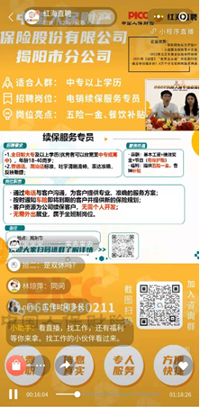 在直播期間,大家對于人保崗位也提出了共性的疑問,如是否雙休、福利待遇、需不需要外出跑客戶等問題,由小紅、小海兩位主播和前期采訪視頻就各類問題都給大家一個圓滿答復。