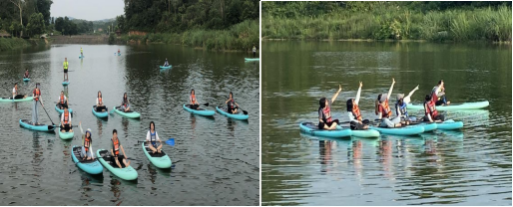 等教練講解完注意事項(xiàng),大家都摩拳擦掌、躍躍欲試,迫不及待 地帶上各自的皮筏艇下水一展身手。大家很快就熟練掌握了水上劃船 技巧,盡情欣賞著湖面上的美景,呼吸著新鮮的空氣,盡情享受著劃 船帶來(lái)的樂(lè)趣,大家不時(shí)發(fā)出歡樂(lè)的笑聲,或互相打水戰(zhàn)、或并排劃 行,交流家庭發(fā)生的趣事、或互相競(jìng)逐。岸上的隊(duì)員則給大家拍照,記錄此刻美好的瞬間和歡聲笑語(yǔ)的隊(duì)員們。