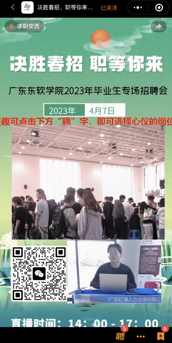 為給用人單位與畢業(yè)生雙向選擇創(chuàng)造有利條件,搭建用人單位與畢業(yè)生雙向交流的平臺,促進(jìn)校內(nèi)畢業(yè)生與用人單位的人才供需對接,實現(xiàn)學(xué)院畢業(yè)生高質(zhì)量充分就業(yè)。4月7日(周五)紅海人力集團(tuán)佛山分公司聯(lián)動廣東東軟學(xué)院展開“決勝春招 職等你來”——2023屆畢業(yè)生校園專場招聘會暨直播帶崗活動。