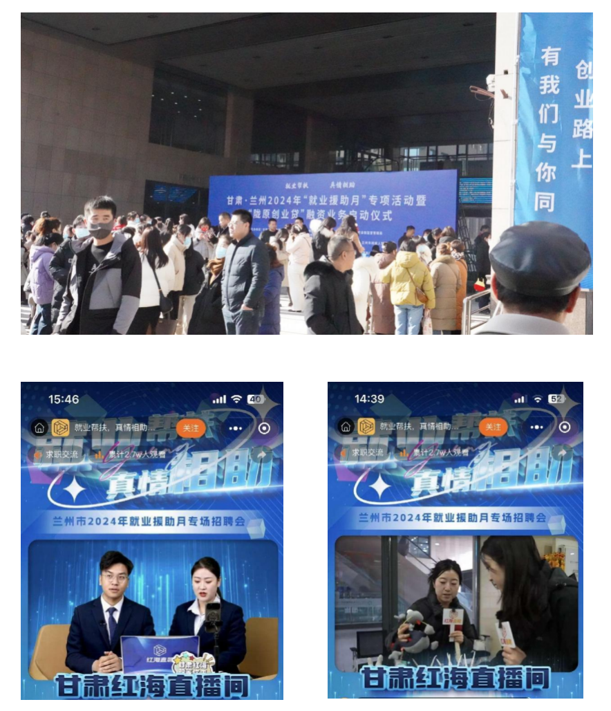 啟動儀式同步舉辦了專場招聘活動,本次招聘會采取“現(xiàn)場招聘+線上招聘+直播帶崗”相結(jié)合的形式舉辦。甘肅紅海人力資源有限公司作為省內(nèi)人力資源行業(yè)直播帶崗優(yōu)秀企業(yè),在會場不僅設置了企業(yè)咨詢區(qū),還設置了直播帶崗區(qū),并在“紅海直聘平臺”及甘肅紅海人力資源有限公司官方網(wǎng)站上建立了“就業(yè)幫扶、真情相助”招聘會專區(qū)。直播以主會場線上送崗+現(xiàn)場采訪+項目展示區(qū)介紹方式進行,讓企業(yè)和求職者“屏對屏”互動、為屏幕前的求職者帶去海量好崗。除線上招聘會和直播間外,線下更是有河南省大化電氣儀表工程技術有限、蘭州生物技術開發(fā)有限公司等1252家優(yōu)質(zhì)企業(yè)提供就業(yè)崗位5125余個。現(xiàn)場共有2300余人進場求職,線上、線下初步達成就業(yè)意向900余人。甘肅紅海人力資源有限公司直播間吸引近2.7萬人次在線互動參與。現(xiàn)場增加直播帶崗和招聘會項目展示區(qū)采訪環(huán)節(jié),主持人走進求職者隊伍中隨機訪問,讓廣大求職者有機會表達求職意向、企業(yè)為活動諫言獻策,使舉辦方為下一次系列活動獲得更多的良好建議。