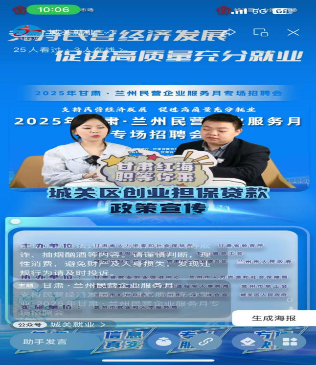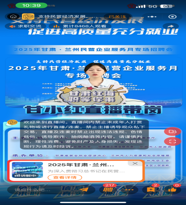 活動(dòng)現(xiàn)場(chǎng)還設(shè)置了直播帶崗區(qū),開(kāi)啟了“線上+線下”招聘新模式。蘭州市人力資源市場(chǎng)直播帶崗聯(lián)合城關(guān)就業(yè)視頻號(hào)、紅海直聘等平臺(tái)進(jìn)行實(shí)時(shí)直播,AI數(shù)字人一體機(jī)也亮相招聘現(xiàn)場(chǎng),通過(guò)智能交互為求職者推薦適配崗位,吸引大量青年求職者駐足體驗(yàn)?!案市〖t直播帶崗”線上直播間累計(jì)觀看量突破1萬(wàn)人次,評(píng)論區(qū)互動(dòng)頻繁,企業(yè)代表在線解答崗位需求,實(shí)現(xiàn)“云端”精準(zhǔn)對(duì)接。