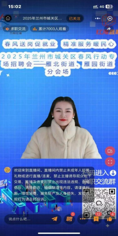 直播帶崗環(huán)節(jié),主播介紹招聘崗位,分享企業(yè)文化、崗位詳情、薪資待遇等信息,并與求職者進行實時互動,解答求職者的疑問。直播間吸引了7000余人觀看。