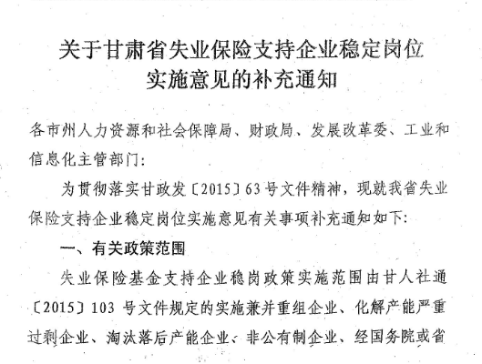 關(guān)于甘肅省失業(yè)保險(xiǎn)支持企業(yè)穩(wěn)定崗位實(shí)施意見(jiàn)的補(bǔ)充通知