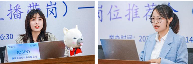 “我們卓詩尼是一家以女鞋為主,箱包、配飾、男鞋為輔的企業(yè),有著三大研發(fā)基地,主要招聘精英、設(shè)計創(chuàng)意、電子商務(wù)、市場營銷和供應(yīng)鏈物流類的管培生?!闭憬吭娔峥毓捎邢薰綡R周麗霞拿著企業(yè)吉祥物妮妮跟直播間的觀眾們打起了招呼,并隨之介紹起企業(yè)文化和崗位需求等信息。