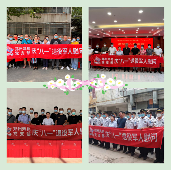 為了迎接中國(guó)人民解放軍建軍九十五周年,自2022年7月27日起,鄭州鴻易黨支部開(kāi)展了為期三天的慶“八一”退役軍人慰問(wèn)活動(dòng)。
