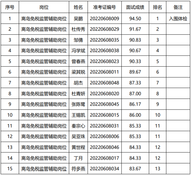 二、海口港海關(guān)離島免稅監(jiān)管輔助崗位協(xié)管員面試成績(jī)表