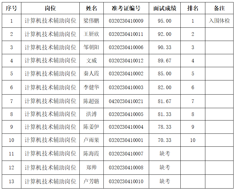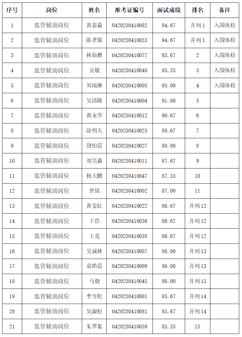 以下入圍體檢人員,體檢具體時間和地點另行短信通知,體檢費用由考生自行承擔。