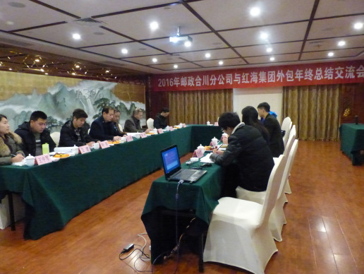 2016年12月26日,嘉陵江畔,古城合川——恭州大酒店二樓會議室,重慶紅海與中郵合川分公司2016年外包項目總結(jié)交流會于下午15時30分準(zhǔn)時召開。會上,雙方就目前合作項目和來年業(yè)務(wù)展望進(jìn)行了全面總結(jié)和廣泛交流,經(jīng)探討研究,達(dá)成全面深化合作基本共識,為重慶紅海2017年開展外包工作夯實了基礎(chǔ),指明了方向。參加會議的有中郵合川分公司黨委書記、總經(jīng)理陳俊,紀(jì)委書記、副總陳齊民及各職能業(yè)務(wù)部門負(fù)責(zé)人共9人。重慶紅海出席會議的有副經(jīng)理婁心靜,市場部經(jīng)理李永朋及合川、鴛鴦?wù)?、黔江項目?jīng)理。會議由重慶紅海許建良主持。