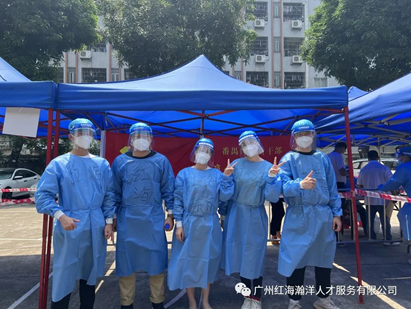 當(dāng)天的核酸檢測工作于下午兩點正式開始,瀚洋人才的小伙伴們?yōu)榱烁玫嘏浜辖值擂k的工作,早早達(dá)到現(xiàn)場。脫去日常的白襯衫,穿上這身防護(hù)裝備,讓他們更有使命感!